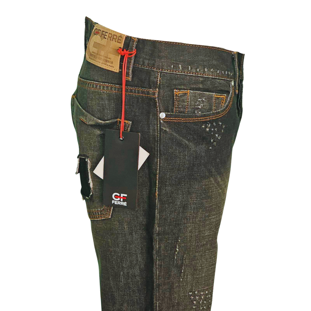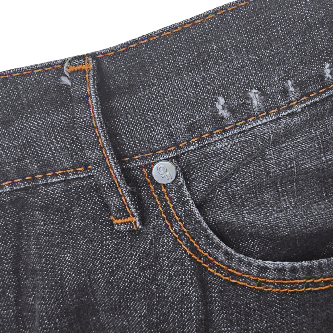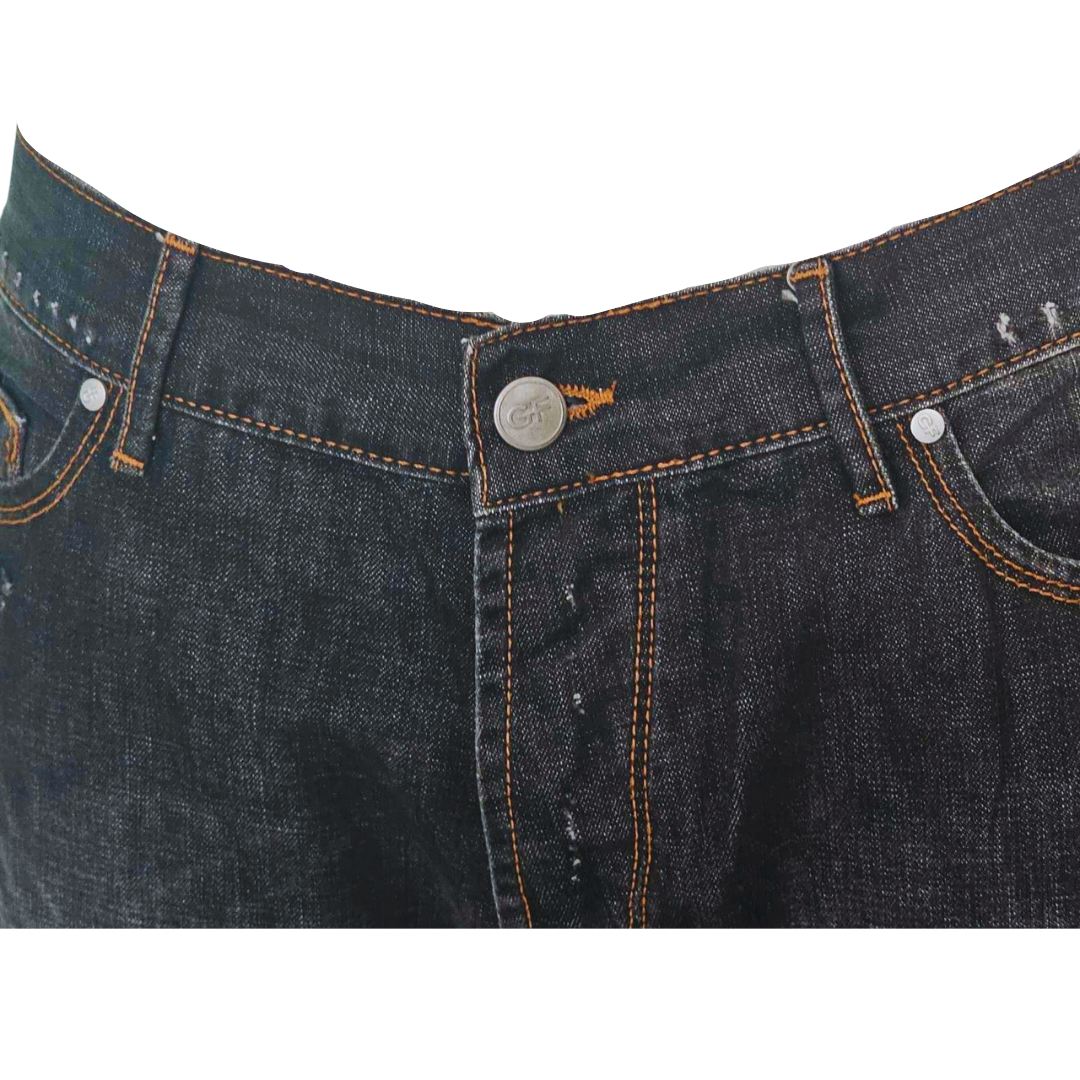 Παντελόνι τζην μαύρο κανονική μέση bootcut με πολλές λεπτομέρειες και επεξεργασίες πορτοκαλί εξωγαζα και εφέ μπαλωμάτων στις πίσω τσέπες,vintage.